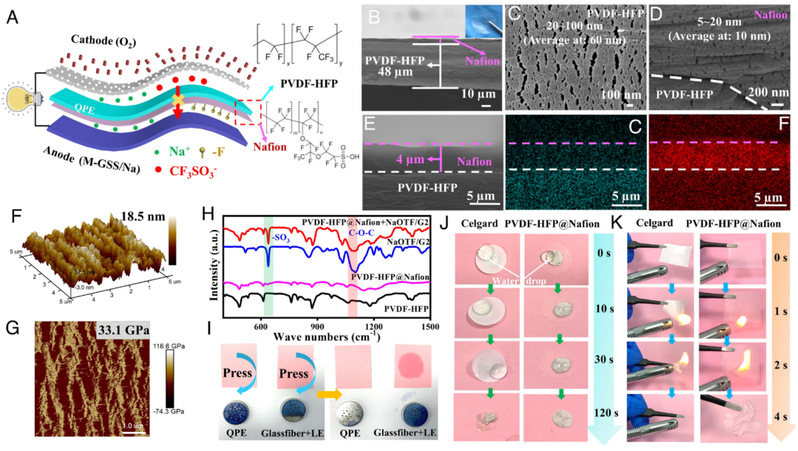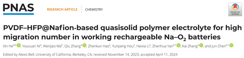 PVDF–HFP@Nafion-based quasisolid polymer electrolyte for high migration number in working rechargeable Na–O2 batteries,PNAS,2024.