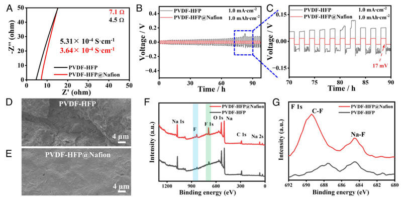 对Na+离子电导率进行了测试,由EIS结果(图3A)可知,PVDF-HFP膜中引入Nafion层使阻抗从4.5 Ω增加到7.1 Ω, Na+离子电导率从5.31×10-4 S cm-1降低到3.64×10-4 S cm-1。由于电解质吸收量的增加缓和了阻抗的增加,离子电导率仍然保持在较高的水平(10-4 S cm-1)。通过恒流放电和充电评价了PVDF-HFP+NaOTF/G2和QPE对称电池的循环稳定性。可以明显地观察到,PVDF-HFP+NaOTF/G2基对称电池在1.0 mA cm-2和1.0 mAh cm-2条件下,电压分布表现出巨大的电压波动。相反,PVDF-HFP@Nafion+NaOTF/G2基对称电池的电压分布保持稳定,过电位低得多,约为17 mV,如图3b和C所示。