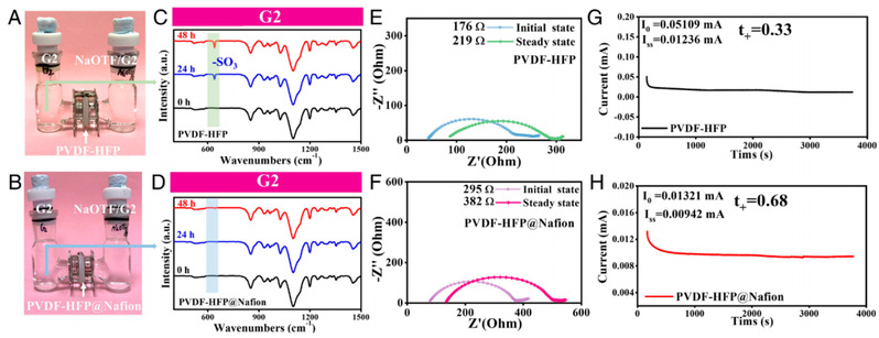 由于具有强电负性的磺酸基团,Nafion层具有选择性渗透性,可以抑制阴离子的迁移。为了验证这一点,在H型反应器的左右两侧分别放置G2溶剂和1 M NaOTF/G2电解质,PVDF-HFP或PVDF-HFP@Nafion膜作为分离器,进行了渗透性实验,如图2a和b所示。为了获得定量数据,用FTIR对h型反应器中不同停留时间(0 h、24 h和48 h)的左右两侧溶剂进行了表征。如图2C所示,基于PVDF-HFP膜的H型反应器,放置24 h后,左侧G2溶剂中出现了-SO3特征峰,说明右侧NaOTF/G2中的-CF3SO3-阴离子穿过PVDF-HFP膜,向左侧迁移。静置48 h后,上述现象更加明显,且增强。相比而言,基于PVDF-HFP@ Nafion膜的H型反应器的左右两侧溶剂的FTIR光谱始终与初始阶段保持一致,如图2D所示。