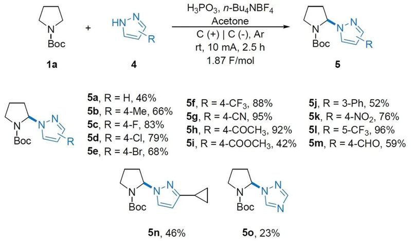 令人欣慰的是,作者发现该反应亦适用于不同取代基的吡唑4,并以42–96%的产率获得相应的α-吡唑化产物5。除此之外,1,2,4-三氮唑(3o)也适用于该反应。