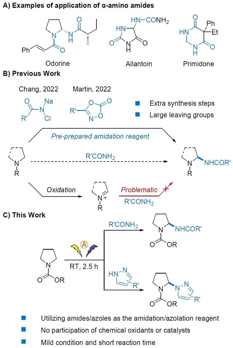 α-酰胺基酰胺类结构存在于多种天然产物、药物与精细化学品中,而烷基酰胺的α-酰胺化,是构建此类结构的一种直接方法。近年来,有多种烷基酰胺的α-酰胺化反应被报道,但这些反应往往依赖需要从相应前体合成的酰胺化试剂,其拥有较大的离去基团,在原子经济性上不利。