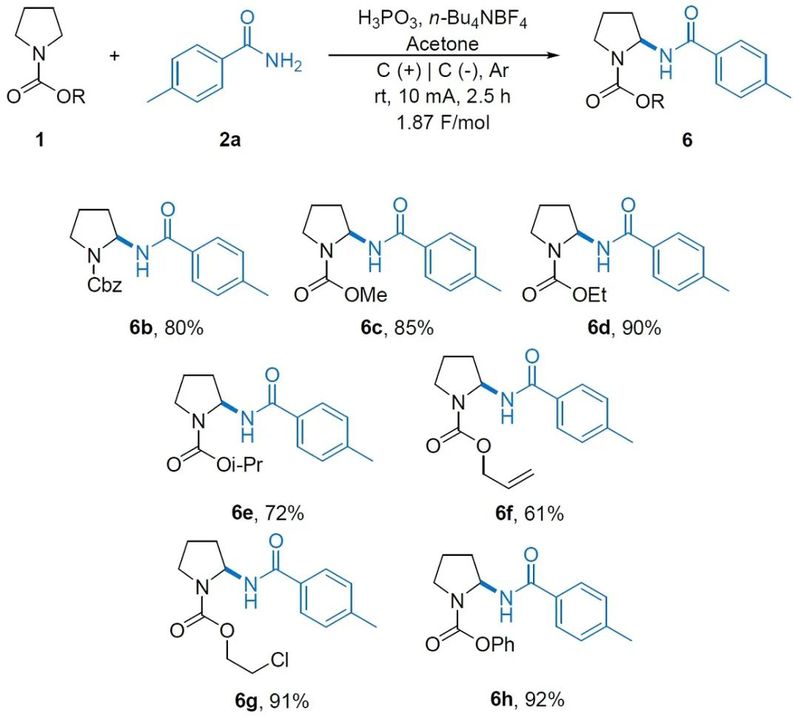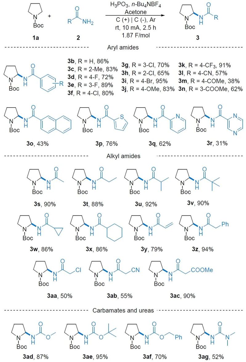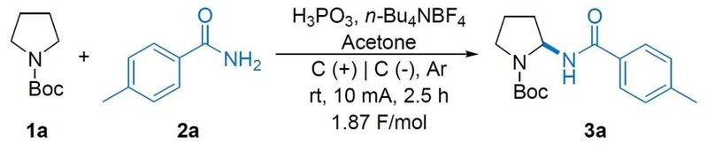 选择N-Boc-吡咯烷(1a),4-甲基苯甲酰胺(2a)为模板底物,亚磷酸为添加剂,四丁基四氟硼酸铵为电解质,丙酮为溶剂,以石墨电极在10 mA电流下电解2.5 h后,可以90%的高收率得到α-交叉偶联产物(3a)。