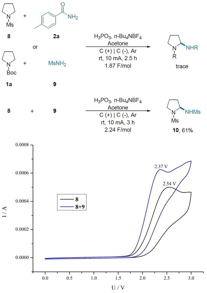 为了进一步支撑1a与2a协同电氧化的机理,作者使用N-Ms-吡咯烷(8)替代1a,或使用甲基磺酰胺(9)替代2a。当1a或2a单独被替代时,相应产物仅能以痕量检测到;但当8与9同时替代1a与2a时,该反应可以61%产率获得相应偶联产物10。循环伏安实验显示,8的氧化峰电位在约2.54 V,明显高于1a与2a,协同电氧化难以发生。加入9后,新的氧化峰电位降至2.37 V。