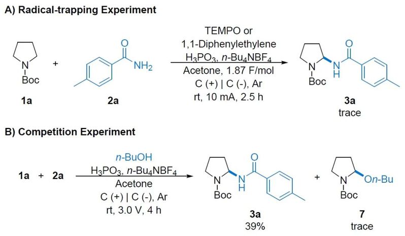 作者在反应体系中加入正丁醇作为竞争性的亲核试剂,发现α-酰胺化产物3a仍然可以39%的产率产生,而α-烷氧基化产物7仅痕量产生。因此,该反应不太可能经由亲核进攻的机理。