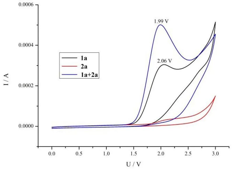 为了进一步探索反应机理,作者测量了1a与2a的循环伏安曲线。1a有电位在2.06 V左右的氧化峰,而2a的氧化峰较弱,电位在约2.1 V左右。当1a与2a混合后,新的氧化峰出现在1.99 V的电位,低于1a与2a各自的氧化峰。作者推断,该反应涉及到1a与2a两种底物的协同电氧化过程。