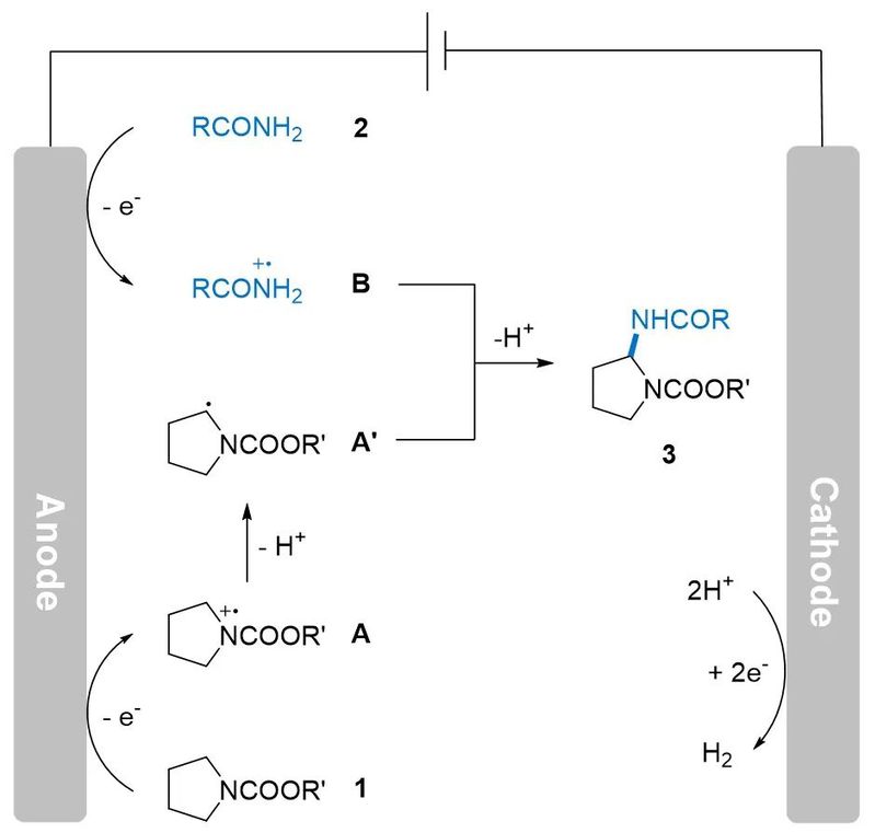 根据上述的实验结果,作者推测该反应经由以下机理:1在阳极上氧化生成自由基正离子A,脱质子后生成自由基中间体A’。与此同时,2在阳极上氧化生成自由基正离子B。A’与B发生偶联以及脱质子过程,生成产物3。
