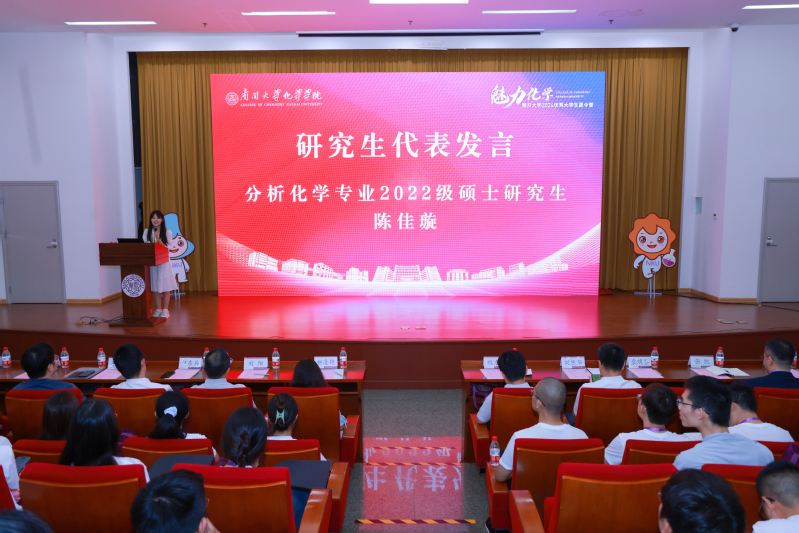 分析化学专业2022级硕士研究生陈佳璇代表在校研究生发言,她从科研经历、学术氛围、课余活动等方面向营员介绍了自己在读期间的科研、学习和生活经历,分享了个人的成长、感想和收获,增进了营员对英国365公司官网的了解,并期望明年九月在南开再次相逢。