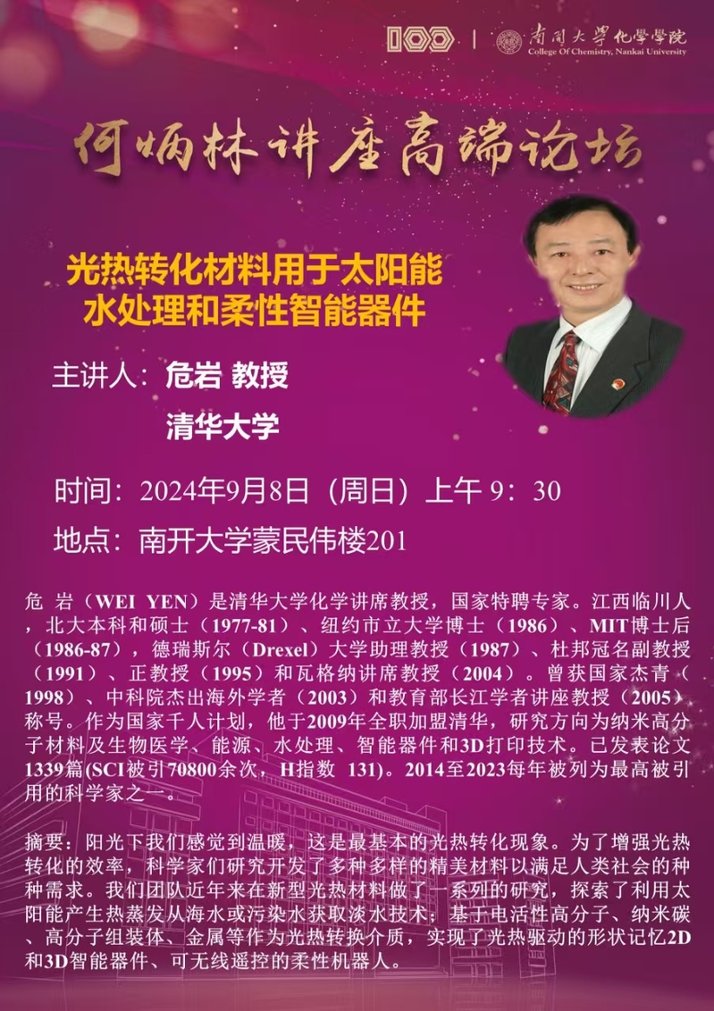 何炳林讲座高端论坛:光热转化材料用于太阳能水处理柔性智能器件
