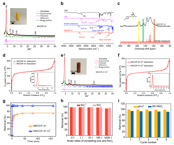 图4. NKCOF-41和NKCOF-41-Cl-的物理表征和含氧阴离子的吸附数据