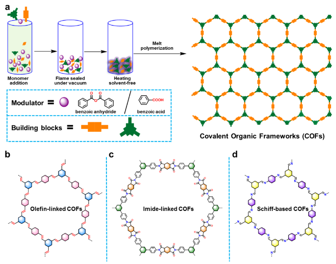 图2.(a)熔融合成策略制备COFs的示意图;(b)乙烯基COFs的结构图;(c)酰亚胺COFs的结构图;(d)席夫碱COFs的结构图