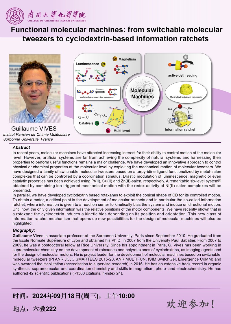 学术报告:Functional molecular machines: from switchable molecular tweezers to cyclodextrin-based information ratchets