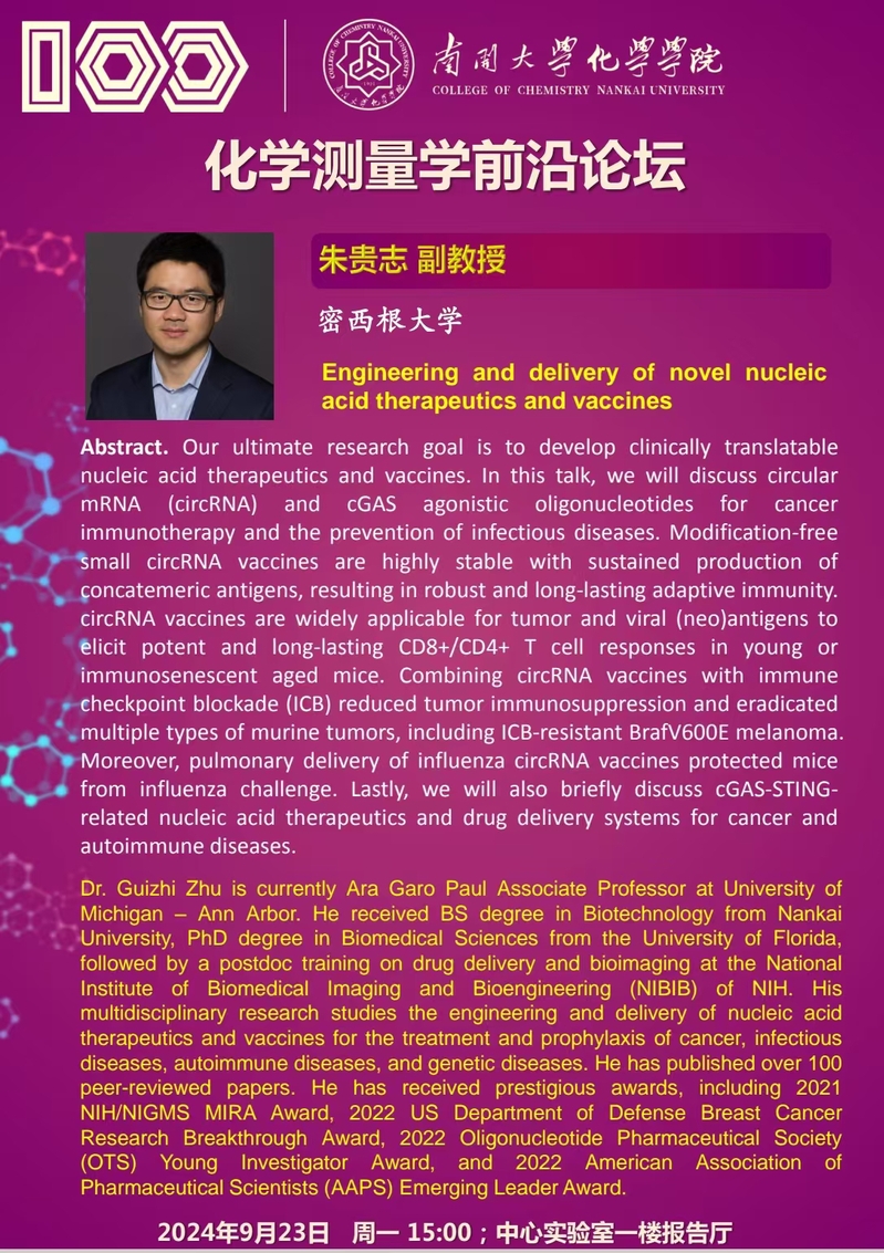 化学测量学前沿论坛:Engineering and delivery of novel nucleic acid therapeutics and vaccines