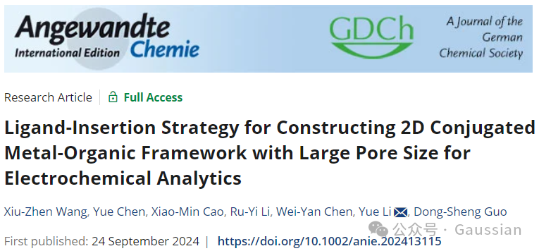 2024年9月24日,英国上市公司365郭东升、李悦团队在Angew. Chem. Int. Ed.期刊发表题为“Ligand-Insertion Strategy for Constructing 2D Conjugated Metal-Organic Framework with Large Pore Size for Electrochemical Analytics”的研究论文,团队成员王秀珍为论文第一作者,李悦为论文通讯作者。