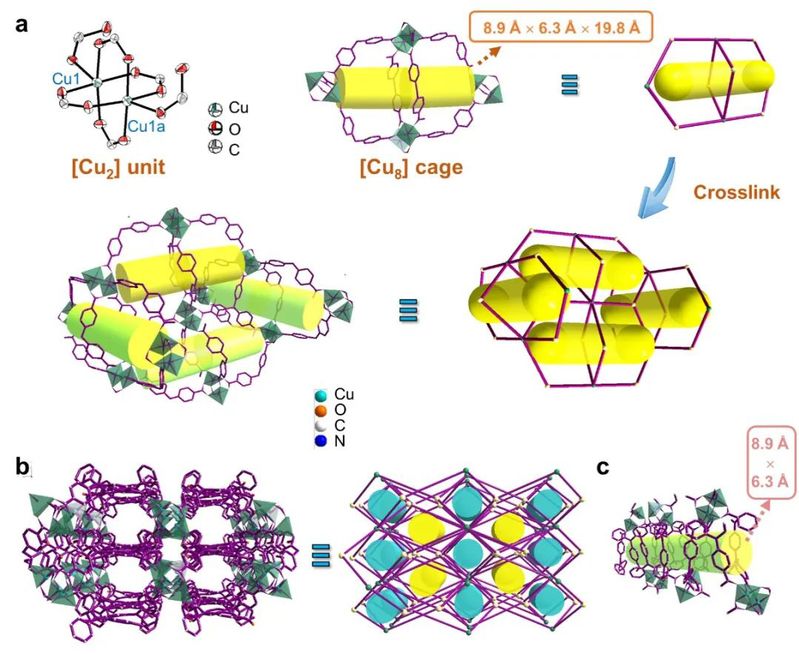 研究者们首先合成了一种新颖的基于双核铜为节点的金属有机框架(MOF)材料1,该双核铜节点与配体连接成一个笼状的[Cu8]结构,该[Cu8]笼进一步进行连接得到三维框架材料(图1)。