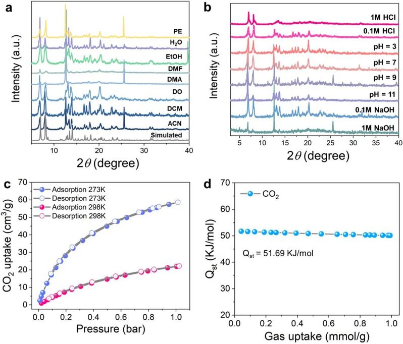 图2. Cu-MOF的溶剂和pH稳定性,及其对CO2吸附能力