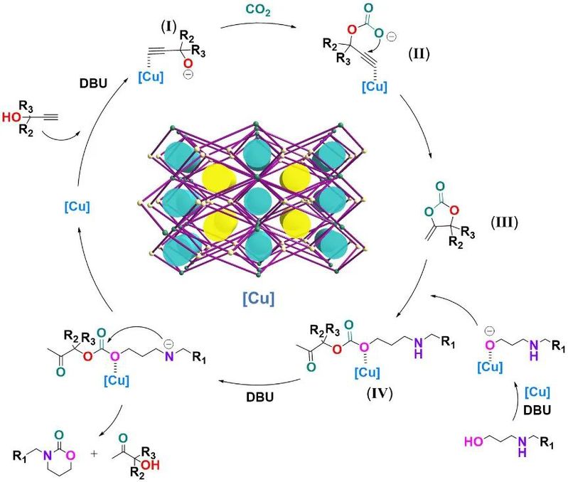 综上所述,本文报道了一种合成1,3-噁嗪-2-酮的新策略,该策略利用一种新型的Cu-MOF作为异相非贵金属基催化剂,可在温和条件下催化CO2与氨基丙醇及炔丙醇反应高效制备1,3-噁嗪-2-酮。该研究为CO2催化转化提供了新的途径和思路。