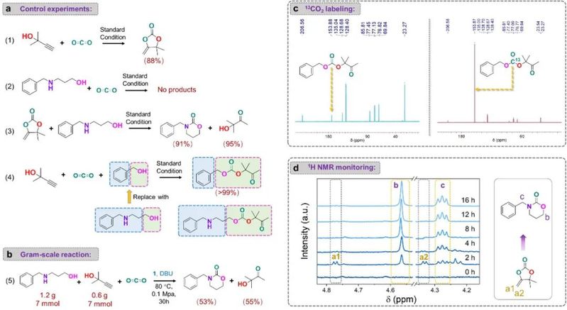 基于以上研究解决,作者推导出的反应机理为:CO2优先与炔醇类底物反应得到环碳酸酯类中间体,该环状碳酸酯中间体被氨基丙醇进攻并开环,得到直链状的碳酸酯中间体,该直链中间体进一步发生自关环,得到最终产物(图5)。