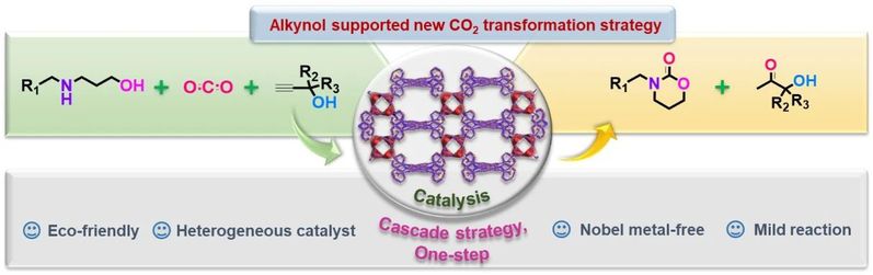 Alkynol supported new cascade strategy for eco-friendly converting CO2 into 1,3-oxazinan-2-ones catalyzed by strong-acid/base-resistant metal-organic framework