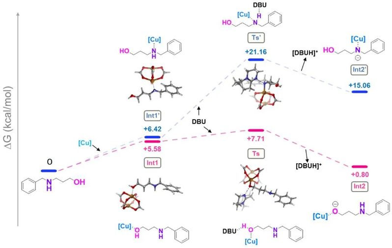 机理研究表明,CO2在Cu-MOF的催化下优先与炔丙醇类底物反应得到环碳酸酯类中间体,随后该环状碳酸酯中间体进一步与氨基丙醇反应,得到最终产物。通过一系列对比实验、13CO2标记及理论计算推导和验证了反应过程及关键的反应中间体(图3和图4)。
