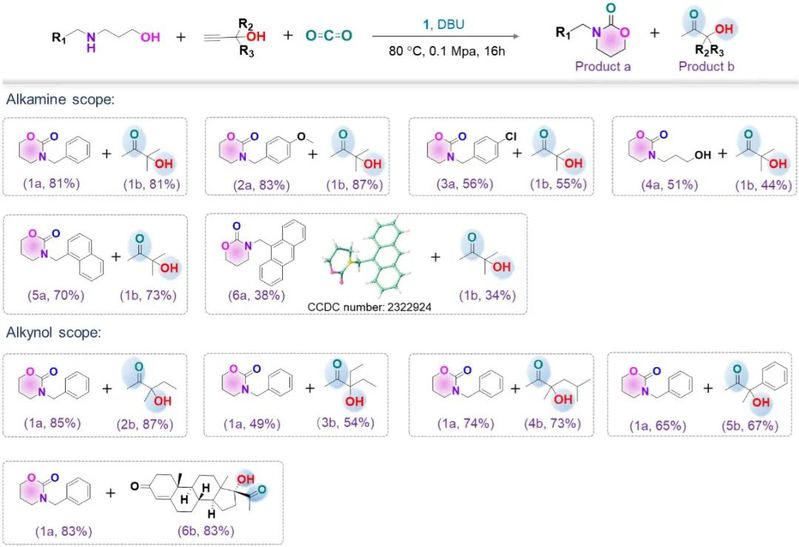 表1. Cu-MOF催化CO2、氨基丙醇与炔丙醇类化合物的三元催化反应