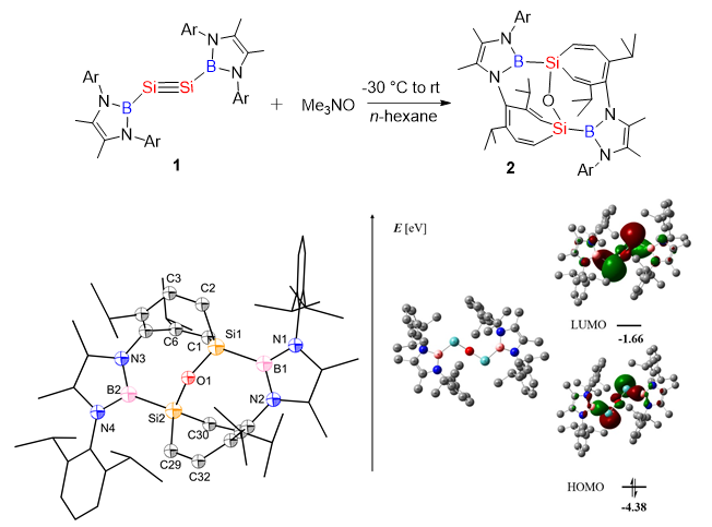 作者设想在通过在Si≡Si三键上控制性插入单原子,就会单原子桥接的二配位双硅宾。通过对插入试剂的探索,发现在−30°C下,二硅炔1与一当量Me3NO在正己烷中反应,缓慢恢复至室温。经过后处理,分离出氧原子插入产物2(图1)。室温条件下,化合物2与苯或甲苯会缓慢反应,但在n-hexane、Et2O和THF中能稳定存在。化合物2的粉末可以在空气中放置一个月,这表明化合物2在固态下对空气是稳定的。从结构分析,不难看出,化合物2是通过相应的氧桥连的双硅宾中间体(NHB)Si-O-Si(NHB) 2'插入到配体中芳环的C=C双键而形成的。尽管作者尝试了多种方法来分离中间体,但是均未成功。作者希望通过密度泛函理论来理解中间体2'的结构。化合物2'的理论模型中 Si1−O1−Si2角为165.39551°,这可能归因于NHB取代基的空间效应。氧桥连双硅宾的HOMO−LUMO能级差为2.63 eV,表明2'的具有很高的活性。