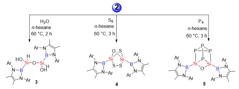 接着作者对2的反应性进行了一系列实验探索。化合物2在正己烷中与水迅速发生水解得到氧桥硅烷醇3,产率为91%。核磁及单晶结构显示两个硅原子从苯环中脱除,紧接着与两分子水发生氧化加成,得到化合物3。化合物3中Si1−O1−Si1a键角为180°,这样的结构对于二硅氧烷并不常见,两个NHB环与Si−O−Si几乎共平面。化合物2也能与S8发生氧化反应得到化合物4(图2)。化合物2也可以活化白磷(图2),以高产率得到Si2P4O簇5。