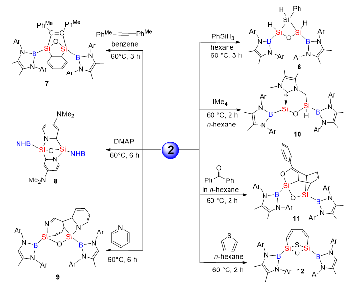 研究发现,化合物2与有机小分子也表现出丰富的反应性(图3)。化合物2两个硅原子先经过还原消除与PhSiH3、二苯基炔烃、吡啶、四甲基卡宾(IMe4)、Ph2CO和噻吩的反应,再经过对底物C-H、Si-H、C=C键和芳香环C=C、C-S和C=N键的氧化加成产生了相应的多环双硅烷(6-12)。与卡宾的反应,比较直观的证明该类反应经历硅宾中间体。与噻吩反应时,实现C-S键的插入,这是硅宾从未报道的反应类型。有意思的是,双硅宾的两个硅原子不仅可以协同活化一个分子中的两个化学键,也能够协同作用形成高活性中间体,从而实现对更惰性分子的活化。例如与二苯基乙炔的反应,首先形成高张力的双环中间体,从而进一步实现了分子间对苯环的去芳构化生成新型氧桥多环硅烷结构。此外,化合物2也可以通过相似方式活化两分子DMAP。