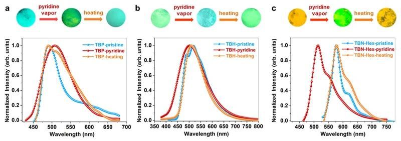 图5. (a–c)四硼杂并苯TBP、TBH和TBN-Hex固体对吡啶蒸汽的刺激响应荧光变化