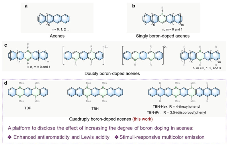 并苯(Acenes)是一类由不同数量苯环线性稠合而成的多环芳烃,因其优异的光电性质被广泛应用于有机半导体材料等领域(图1a)。将硼原子引入并苯骨架中构成了一类新型硼杂并苯分子,其在有机发光材料中表现出极大的研究价值。尽管在过去的几十年里人们发展了不同骨架长度的硼杂并苯,但硼原子掺杂数量只局限在单硼和双硼掺杂,极大地限制了该类材料的化学多样性与光电性质调控空间(图1b–c)。