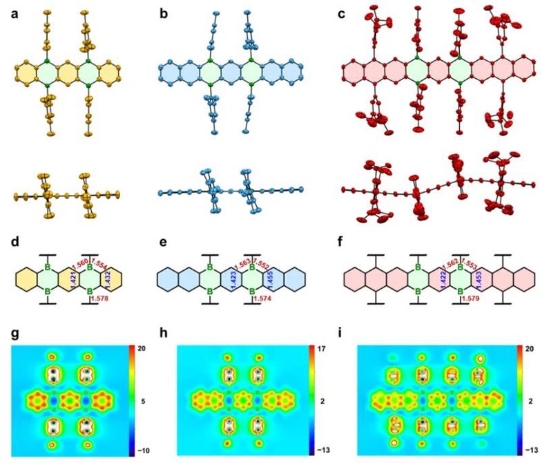 图3. 四硼杂并苯TBP、TBH和TBN-iPr的(a–f)单晶结构和(g–i)2D-ICSS图