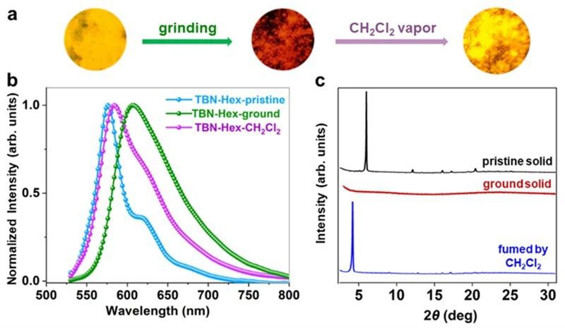 图6. (a–b)四硼杂并九苯TBN-Hex的力致荧光变色现象以及(c)相应的粉末X射线衍射(PXRD)图