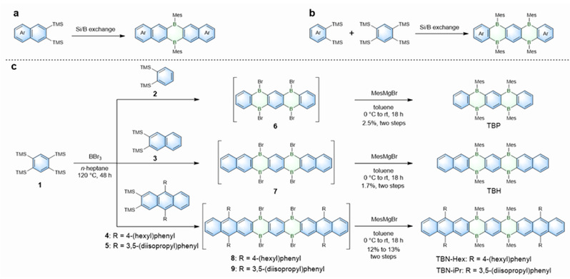 图2. (a)已报道的基于Si/B交换反应的AA型交叉环化策略合成双硼杂并苯;(b)本工作发展的ABA型交叉环化策略;(c)四硼杂并苯的合成路线。