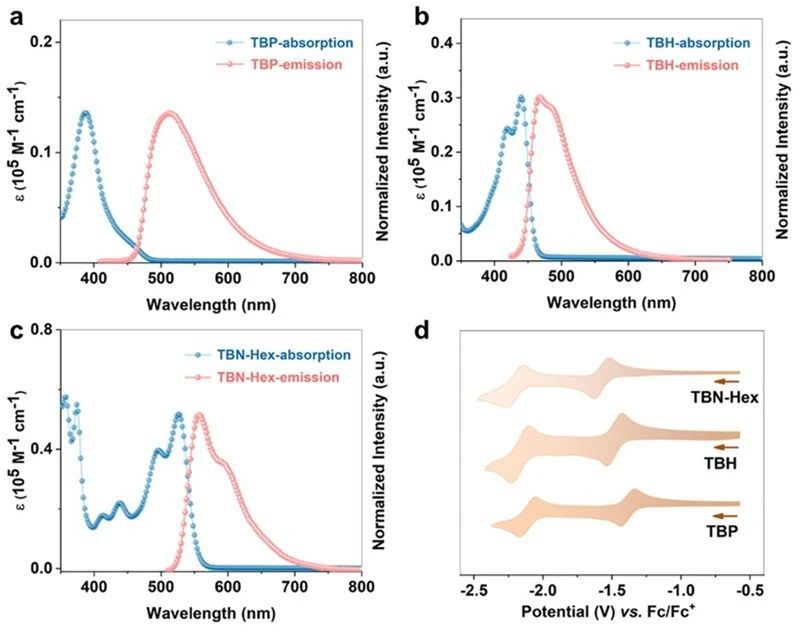 图4. 四硼杂并苯TBP、TBH和TBN-Hex的(a–c)吸收发射光谱和(d)循环伏安(CV)还原曲线