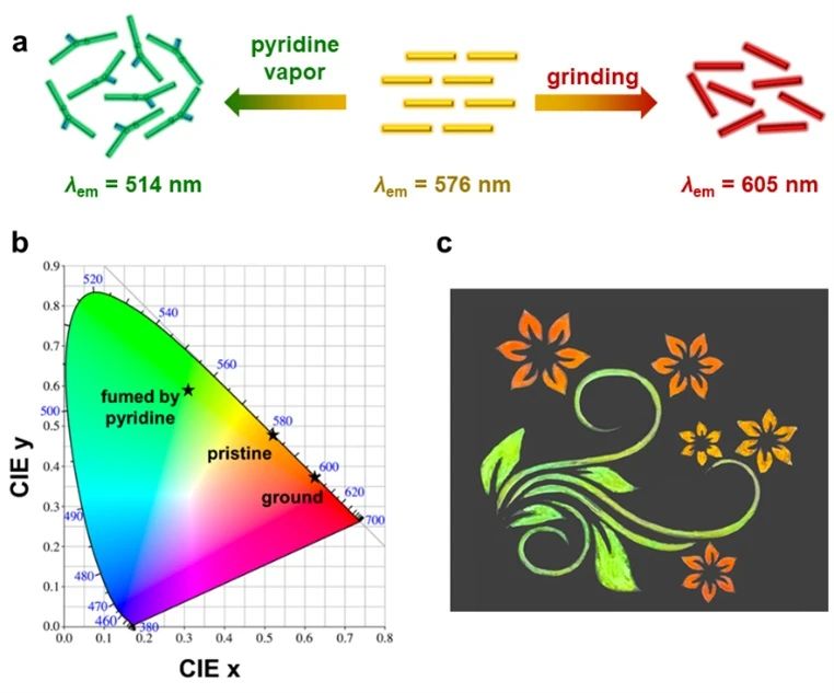 最后,作者首次将Lewis碱刺激响应与力致荧光变色相结合用于调控硼杂并苯的发光性质,实现了四硼杂并九苯的固态多色发光,且荧光波长变化范围(∆λem=91 nm)为现有硼杂稠环材料中的最高值(图7)。基于此,利用单一化合物可以在纸上勾勒出多彩的图案。