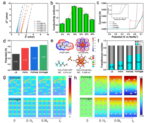 图3. 不同MOF含量对应PVFH@M的(a)EIS阻抗谱及(b)离子电导率对比。常规电解液、PVFH、PVFH/M和PVFH@M对应的(c)LSV曲线及(d)分解电压对比。(e)PVDF-HFP、UIO-66-NH2的静电势及ClO–4与二者之间的结合能。(f)常规电解液、PVFH、PVFH/M和PVFH@M对应的钠离子迁移数对比。COMSOL模拟不同弛豫时间下(g)PVFH/M和(h)PVFH@M对应的离子流和电场分布。
