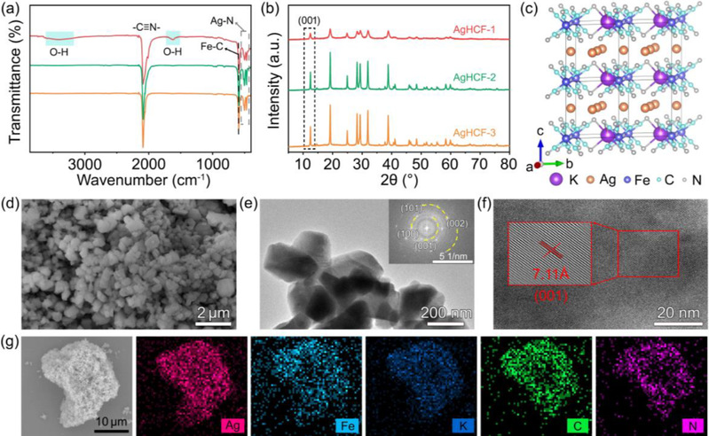 图1 AgHCF-1、AgHCF-2和AgHCF-3的 (a) FTIR谱图和 (b) XRD谱图。AgHCF-3的 (c) 晶体结构模型,(d) SEM,(e) TEM (插图是SAED模式),(f) HRTEM图像和 (g) 元素分布图。