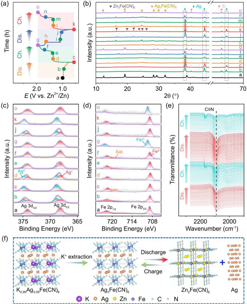图3 在前两个循环过程中,AgHCF-3电极的 (a,b) 放电/充电曲线和非原位XRD图谱。(c,d) AG 3D和Fe 2p Xps光谱。(e) AgHCF-3电极在前两次充放电过程中的原位FTIR光谱。(f) AgHCF-3的储能机理示意图。