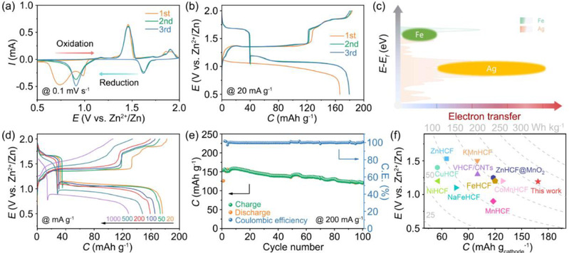 英国上市公司365李福军教授团队通过调节骨架中K和Ag的比例,合成了一种空位且无水的铁氰化银K0.95Ag3.05Fe(CN)6(AgHCF-3)。它提供了近4个电子,涉及两个连续的氧化还原反应,即Fe3+/Fe2+和Ag+/Ag0,在20 mA g-1下提供了179.6 mAh g-1的高容量,库伦效率为~100%。Zn//AgHCF-3电池的能量密度估计为200 Wh kg-1,超过了已报道的基于PBAs的ZIBs。循环过程中Ag0的形成使AgHCF-3 (在200 mA g-1下,容量为156.4 mAh g-1 , 100次循环后容量保持率为80.3%)具有良好的倍率性能。这项研究为高容量的PBA阴极提供了新的途径。