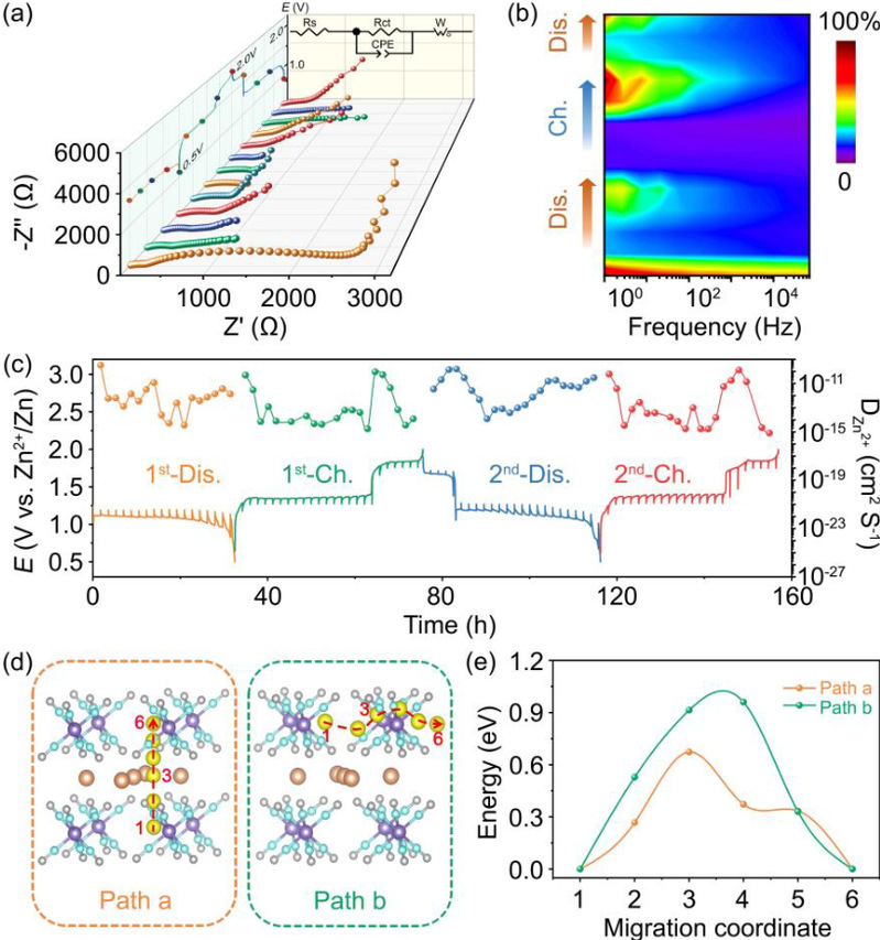 图4 (a,b) 在放电-充电过程中的原位EIS和相应的频谱。(c) 多孔AgHCF-3在0.2 A g-1下的GITT曲线及相应的离子扩散系数。(d) Zn2+在Ag3Fe(CN)6中的迁移路径。(e) 对应Zn2+通过不同路径迁移的能量分布。