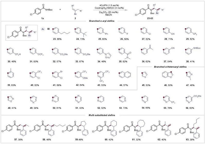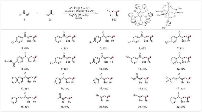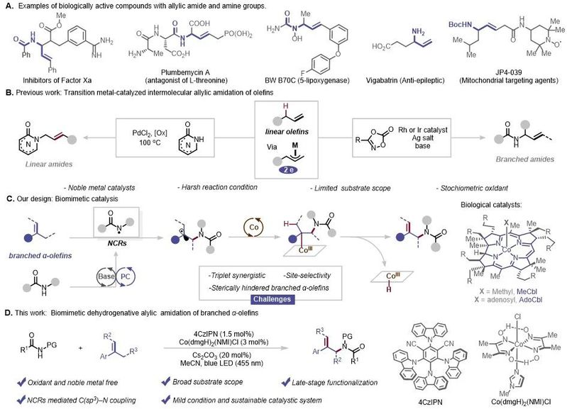 作者开发了一种温和、高效的方法,以简单酰亚胺和支链α-烯烃为原料,实现了仿生脱氢的分子间烯丙基酰胺化反应,得到了一系列取代的烯丙基酰胺。反应通过双Brønsted碱/光氧化还原催化剂协同作用产生用于形成C(sp3)-N键的氮中心自由基,随后钴-/光氧化还原协同催化的实现反应的脱氢交叉偶联。该方法具有广泛的底物范围、良好的官能团兼容性,可用于结构复杂的分子的转化。此外,烯丙基酰胺可以作为重要中间体进一步转化为多种有用的有机化合物。最后,作者相信这种仿生的多重催化反应为烯丙基化反应注入新的活力。