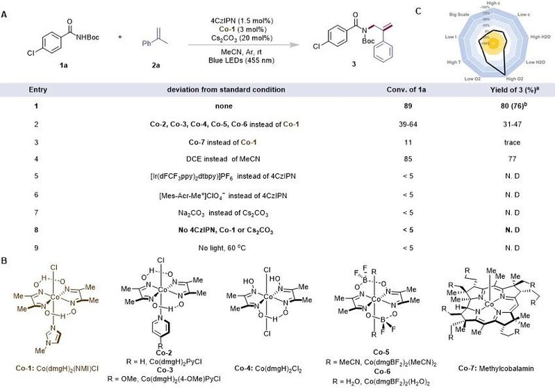 可见光诱导的转化不仅可以在温和的条件下将有机官能团生成多种自由基中间体,而且可以生成或裂解之前传统双电子化学难以实现的化学键。例如,氮中心自由基(NCR)的发展使得生成有价值的、以前具有挑战性的含氮化合物成为可能。此外,NCR的化学性质为构建C(sp3)-N键提供了多种可能性。然而,通过NCR介导的协同光氧化还原/钴肟催化的脱氢烯丙基胺化尚未报道。在本篇文章中,作者设想通过Brønsted碱/光氧化还原催化产生的NCR介导的C(sp3)-N 键形成。随后,钴肟催化选择性消除β-H形成不饱和键并提供烯丙基酰胺产物(图1C)。实现该设想需要克服几个挑战:(1)氮中心自由基可能会添加到烯烃中形成空间位阻的自由基中间体,这些自由基中间体需要被匹配的钴种类捕获;(2)钴中间体将选择性地进行β-H消除反应,而不是进行氢化反应生成烷基酰胺;(3)光催化剂、钴和Brønsted碱的组合将是相互依赖和再生的,这需要催化同步。综上,作者开发了一种通用的温和方法,用于支链 α-烯烃的仿生脱氢分子间形式烯丙基酰胺化,用于通过光氧化还原、钴和Brønsted碱催化的组合构建取代烯丙基酰胺(图1D)。