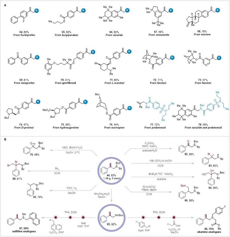 由于杂芳基是药物化合物中普遍存在的重要官能团,因此作者研究了与杂芳基支链 α-烯烃的反应。带有噻吩(45)、苯并呋喃(46)、N-甲基吡唑(47)、噻唑(48)、嘧啶(49,50) 或吡嗪(31)环的底物提供了相应的烯丙基酰胺,产率中等至良好。值得注意的是,带有吡啶环的支链α-烯烃以52-76%的收率提供了多种产品(52-56)。此外,空间位阻多取代烯烃适用于这种转化,尽管产率较低,但仍能得到57和58。此外,基于环戊烯、环己烯和环庚烯的底物成功功能化,分别形成所需的产物59-61。作者证明了也可以获得支链烯丙基酰胺(62, 63),这表明该方法的广泛底物范围。温和的条件使该反应适用于各种天然产物和药物分子的修饰(图 5A)。例如,从氟比洛芬(64)、对羟基苯甲酸丁酯(65)、托那利(66)、天青素(67)、雌酮(68)、酮洛芬(69)、吉非罗齐(70)、L-薄荷醇(71)、芬酚(72和73)、D-脯氨酸(74)、羟脯氨酸(75)和去甲托品(76)衍生的支链α-烯烃成功通过反应,证明其具有很强的官能团相容性。丙磺舒的N-Boc酰胺衍生物与适当的偶联伴侣结合时,产物77和78的产率分别为72%和58%,这表明该反应在药物化学中的潜力。