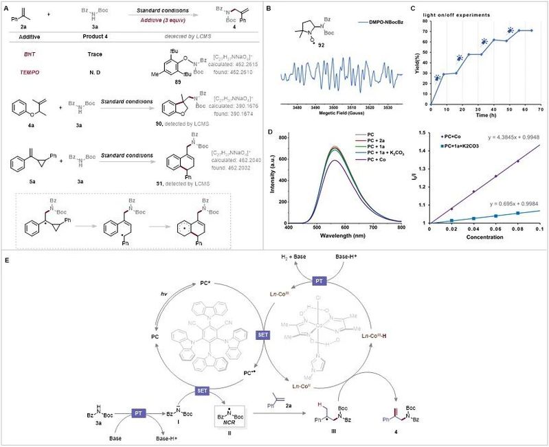 作者提出了图6E所示的反应机理。首先,由PC的可见光照射产生的PC*激发态被CoIII物种淬灭,生成PC•+和活性CoII物质。在碱存在下,N-Boc苯甲酰胺3a去质子化生成亚胺阴离I。亚胺阴离子I被PC•+被氧化,得到关键的NCR II并再生光催化剂。随后,氮中心自由基II加成到支链α-烯烃2a中,形成C(sp3)-N键并提供中间体III,最后通过选择性β-H消除过程得到产物4和CoIII-H物种。CoIII-H物种的淬灭会再生CoIII物质并释放出氢气以关闭催化循环。