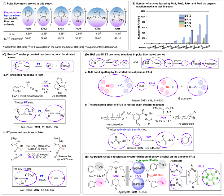 图1. 极性氟代芳烃的结构和极性性质(A);年发表量的指数性增长(B);此类溶剂中质子转移PT反应和HAT/PCET反应的促进性能,和通过簇集效应加速电化学氧化催化反应(C、D、E)。