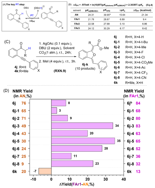 随后,该团队发现,使用这些实验pKa数据和基于实验建立的理论方法,从热力学上考察,可以预测极性氟代芳烃比乙腈作为反应介质将更有利于酮衍生物的去质子化,从而增强了去质子化促进的 CO2固定反应性能。该团队通过实验数据证明了该预测的准确性(图3)。因此,本研究测定的pKa值可以作为极性氟代芳烃中C-H键形成和断裂反应的重要指导工具。