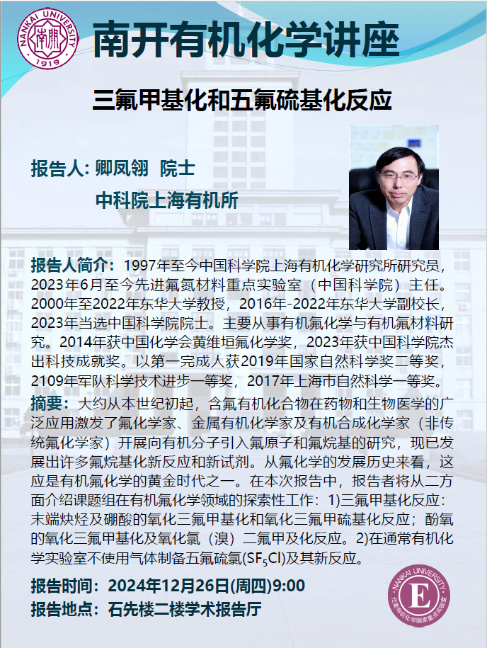 南开有机化学讲座:三氟甲基化和五氟硫基化反应