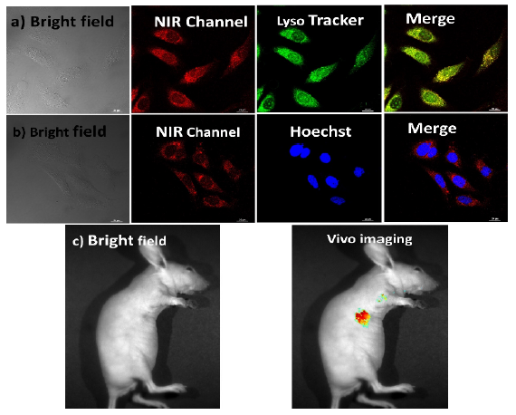 随后,由于PRET构建的纳米超分子具有良好的近红外磷光性能,并与带负电荷的透明质酸单元组装形成纳米颗粒,作者尝试将其作为靶想细胞成像的超分子近红外磷光探针。首先,用HAPY/CB[8]/G1培养HeLa细胞24 h,激光共聚焦显微镜观察。与发光微弱的293T细胞形成鲜明对比的是,HeLa细胞显示红色信号(图4a),这可能是由于纳米粒子的透明质酸单元可以被癌细胞的CD44受体识别,并促进它们进入癌细胞。作者进一步探索了近红外磷光探针在细胞器中的定位能力。经过近红外磷光组装体培养后,进一步用溶酶体探针(LysoTracker绿色)和细胞核染料(Hoechst)处理HeLa细胞。从图4a可以看出,LysoTracker的绿色荧光可以与HAPY/CB[8]/G1的红色荧光重叠,在合并后的图像中发出明亮的黄色信号,表明该溶酶体具有靶向标记能力。然而,从图4b的合并图来看,近红外探针无法定位在核内。因此,制备的近红外磷光超分子可以在癌细胞中靶向标记溶酶体。此外,还通过小鼠HeLa细胞模型评估了纳米探针在体内的成像能力。尾静脉注射(8 h)后,通过皮肤在肿瘤部位观察到红色信号(图4c),表明组装体在肿瘤部位积聚。因此,制备的近红外磷光纳米超分子具有针对溶酶体的靶向能力,可用于体内成像。