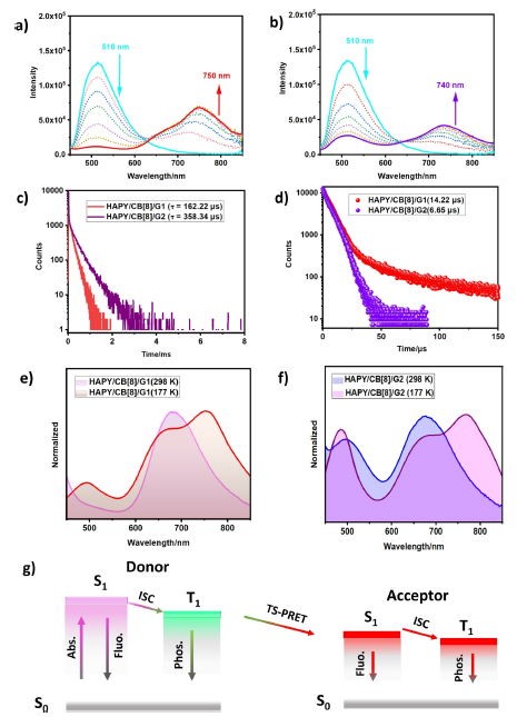 从以上结果可以看出,通过CB[n]限制,成功实现了可调的超分子磷光性能。作者进一步应用了磷光大环超分子和苯基桥联吩噻嗪衍生物(G1和G2)构建高效的PRET体系。如图2a、b所示,G1或G2存在时,HAPY/CB[8]的磷光强度逐渐降低,分别在750 nm和740 nm处出现新的发射信号。此外,HAPY/CB[8]的寿命从1.27 ms降低到162.22 μs和358.34 μs(图2c),初步表明HAPY/CB[8]的激发能转移到了吩噻嗪衍生物上。测定了HAPY/CB[8]/G1和HAPY/CB[8]/G2共聚体的近红外发射峰寿命分别为14.22 μs和6.65 μs(图2d)。图2e显示,组装体的荧光峰出现在680 nm处;因此,750 nm处的发射峰属于吩噻嗪的磷光信号。此外,在177 K时,超分子共聚体的光致发光光谱(图2e,f)在750 nm处有一个增强的发光峰。确认了750 nm的发光信号为磷光。根据得到的实验结果,可能的超分子能量传递机制(图2g)是HAPY在CB[8]的约束下产生高效的磷光发射。当它与吩噻嗪的阳离子络合形成异源二聚体后,能量从三重态体供体转移到单线态受体,然后在组装体中激子从单线态受体系间窜跃到三重态,从而产生长寿命的红色磷光。