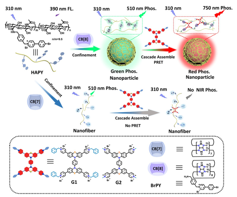 基于人工大环的纳米超分子不仅可以调节组装形态,还可以增强磷光共振能量转移(PRET)。在此,通过将透明质酸修饰的溴苯基吡啶(HAPY)、葫芦[n]脲(CB[n], n = 7/8)和能量受体苯桥联的吩噻嗪衍生物组装成水溶性磷光超分子,实现了高效的PRET,并通过大环CB[n]和组装限制实现了近红外(NIR)磷光发射。与HAPY/CB[7]的弱磷光纳米纤维相比,HAPY/CB[8]的球形纳米粒子不仅具有长达1.27 ms寿命的强绿色磷光,还可以作为能量供体,限制吩噻嗪阳离子在二次组装中的分布,从而实现从磷光体到三重态受体的高效PRET,实现在750 nm处的磷光发射和440 nm的超大斯托克斯位移。最终,通过多尺度约束增强的PRET纳米组装体成功应用于癌细胞靶向成像,为制备近红外磷光材料提供了新的见解。