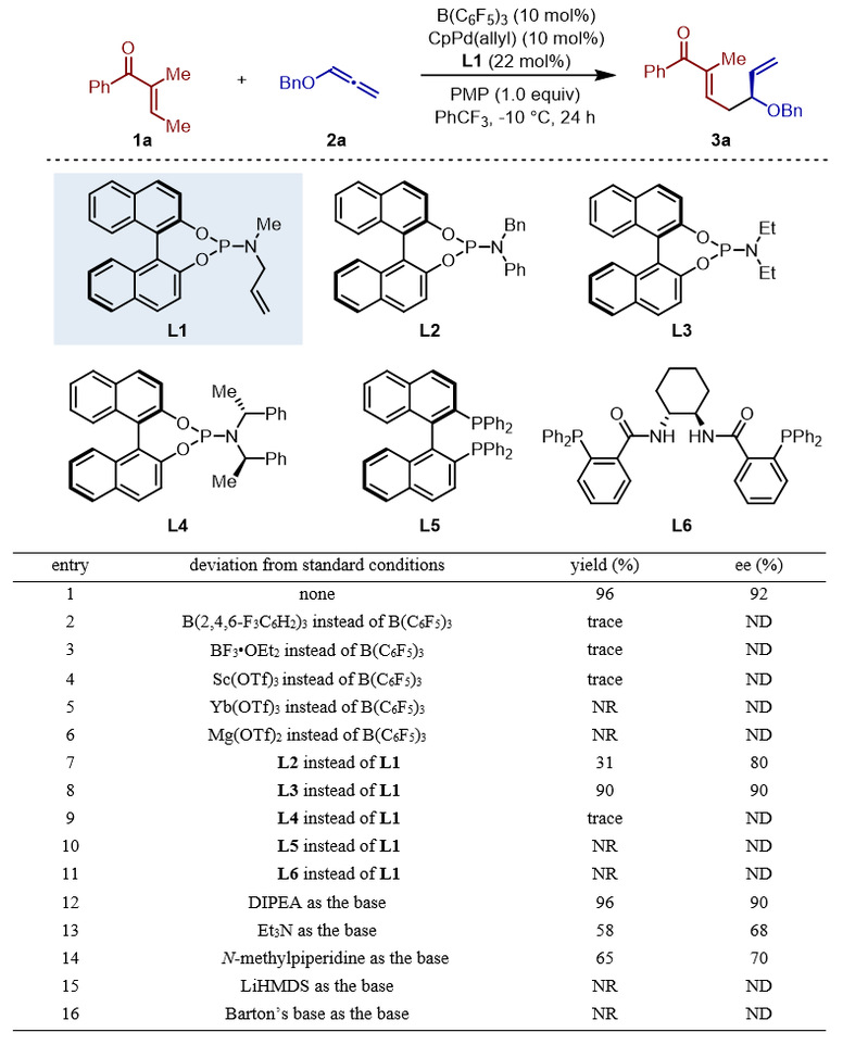 烯酮γ位去质子化后生成的二烯醇中间体可与多种亲电试剂发生偶联反应,然而金属催化烯酮γ位与不饱和烃的偶联反应还未见报道。原因在于其γ位酸性很弱(1a,pKa = 25.8 in DMSO),需要使用KHMDS等强碱对其去质子化(图1b);然而,生成的TMS2NH酸性更弱(pKa = 30 in DMSO),难以对金属质子化。近期,王晓晨课题组开发了一种手性螺环双硼催化剂,并成功将其用于催化烯酮γ位与亚胺的不对称曼尼希反应(J. Am. Chem. Soc. 2021, 143, 3054−3059)。反应顺利进行的关键在于,硼烷催化剂通过配位显著增强烯酮γ位酸性,使得三烷基胺就可以完成去质子化。作者推测,由于携带质子的三烷基胺酸性较强(H-NEt3+, DMSO,pKa = 9.0),应该可以实现对钯催化剂质子化,从而建立钯催化循环。由此,作者设想,以三烷基胺作为质子梭,通过硼/钯协同催化策略,有望实现烯酮γ位与联烯的加成反应(图1c)。(注:文中提到的部分pKa数值由清华大学罗三中教授团队开发的人工智能模型计算得到;测量pKa数值参考了Bordwell pKa Table和英国上市公司365/清华大学程津培教授团队开发的iBonD数据库)